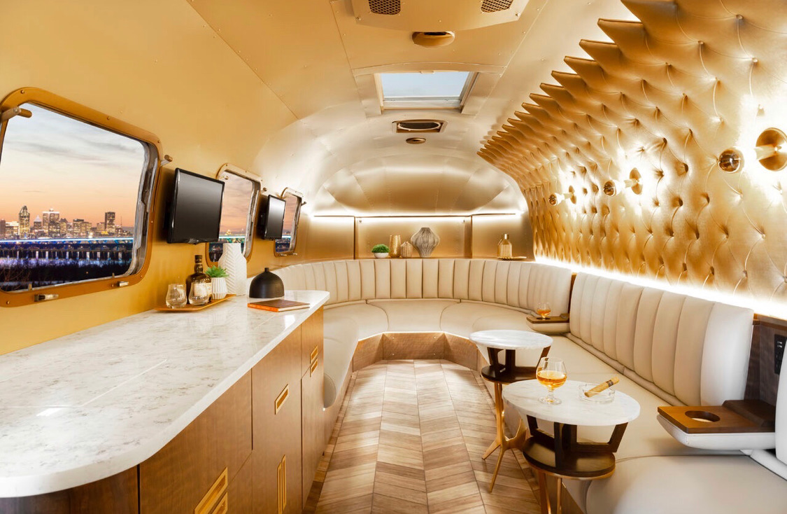 LuXeStream is a custom-built upscale mobile event space curated to amaze customers and provide the ultimate experience like no other. This unique 31-foot airstream features: 2 -55" TV's, 3- 19" monitors, 2 skylights, adjustable ambience lighting, a cigar humidor, a mini refrigerator, heated floors, media outlets, and leather club and bench seating for 15 people. This climate-controlled environment has a ventilation system (4 air purifiers and two power roof ventilators) to whisk away smoke without leaving the slightest smell.